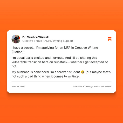 P.S. Only a couple of spots remain in the Focused ADHD Writers Group. Click here to learn more and apply. We start January 7.